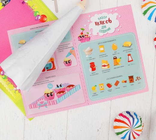Набор для создания кексов Пожелания - в набор входят кондитерские принадлежности и простые рецепты популярных сладостей с иллюстрациями. С их помощью кроха приготовит вкусные лакомства вместе с родителями.