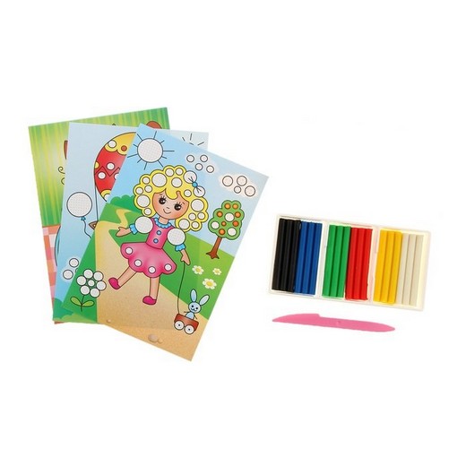 Комплект: 6 кусочков пластилина, 4 рисунка, стек.