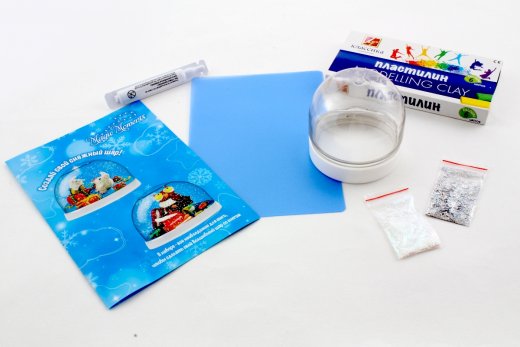 Состав набора: подробная инструкция, сферическая основа для шара, фигурная подставка для сувенира, цветной пластилин, доска для лепки, специальная жидкость, два вида блесток для создания снежного эффекта