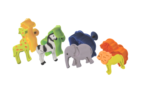 В набор "Зоопарк" входит пушистый пластилин четырех цветов, четыре пластиковые формочки, схемы лепки, а также настольная игра с заданиями, при этом формочки из комплекта в виде зверюшек .