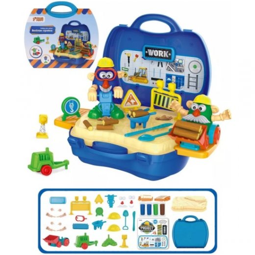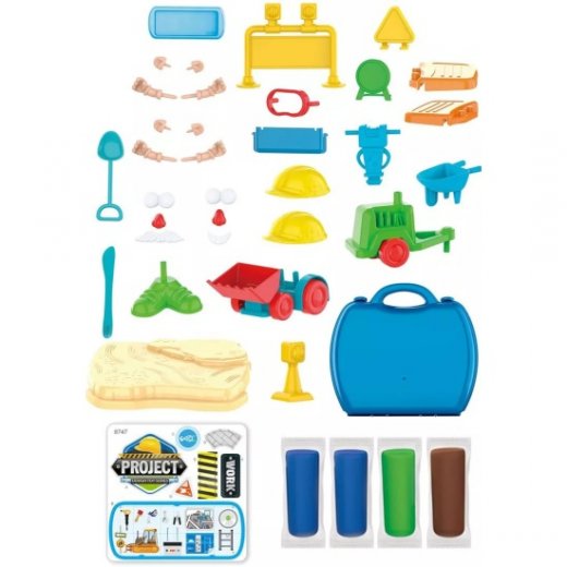 В чемоданчике с набором «Стройка» можно найти так много интересного! Это и тесто для лепки 3-х различных цветов и 33 аксессуара для настоящих строителей, и яркие декоративные наклейки. Для начала нужно разложить чемоданчик, аккуратно разобрать все предметы и персонализировать 2-х человечков при помощи пластилина, глазок, носа, рта, рук и кепок, украсить наклейками чемоданчик и аксессуары. Ну а потом можно смело приступать к весёлой стройке! Объём теста составляет 110 грамм. Изготовлено из полимерных материалов и теста (состав: мука, соль, вода, пищевые красители).