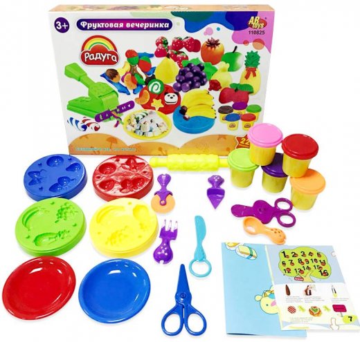 Набор для лепки Фруктовая вечеринка – состоит из 5 баночек с массой для лепки разных цветов. Также в набор входят тематические аксессуары и приборы, призванные помочь ребенку в нарезке, раскатывании и выдавливании фигурок из пластилиновой массы. Комплект состоит из 22 предметов, одним из которых является красочная подробная инструкция, которая поможет ребенку научиться изготавливать различные фрукты из пластилина. Оригинальные формочки помогут изготовить 14 различных фигурок фруктов.