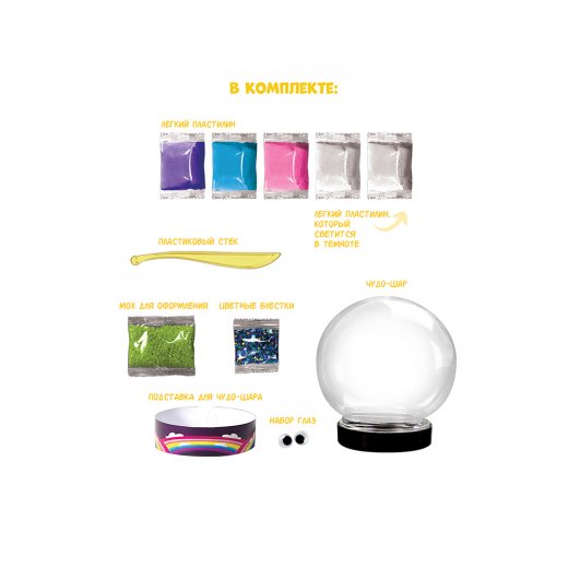 В набор входят: легкий пластилин несколько цветов для создания единорога, блестки и декоративный мох для украшения, красочная подставка под чудо-шар, глазки для фигурки, стек. Поймай магию в шар и сделай сувенир-подарок своими руками! Выбирай своего волшебного персонажа или собери и слепи всех!