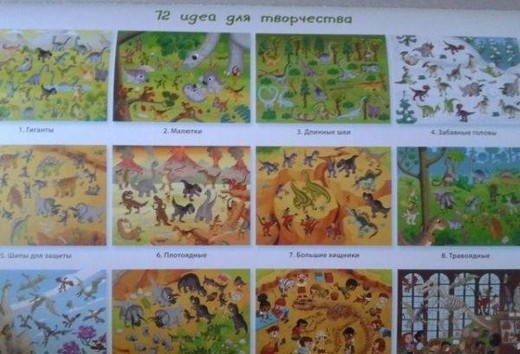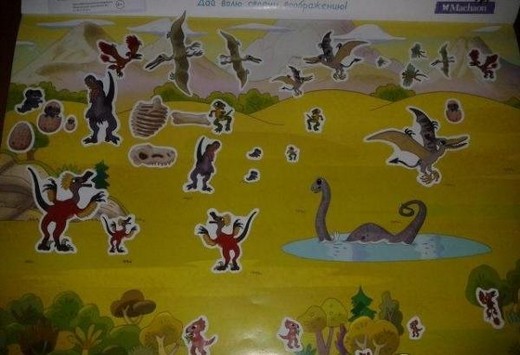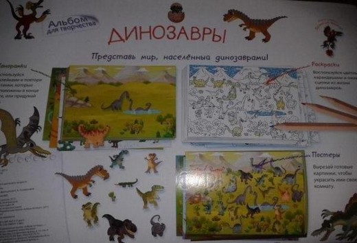 Представьте мир населённый динозаврами! Ребенку нужно лишь воспользоваться наклейками и повторить картинки, которые расположены в конце книги, или же придумать свои. Воспользуйся цветными карандашами и оживить сценки из жизни динозавров, вырезать готовые картинки, чтобы украсить ими свою комнату. Несомненно эта игра приведет ребенка в восторг, ему л ишь нужно дать волю своему воображению и окунуться в мир динозавров. Это не только развлечение, но и польза- это способствует развитию зрительной памяти, мелкой моторике рук, фантазии и творческому мышлению.