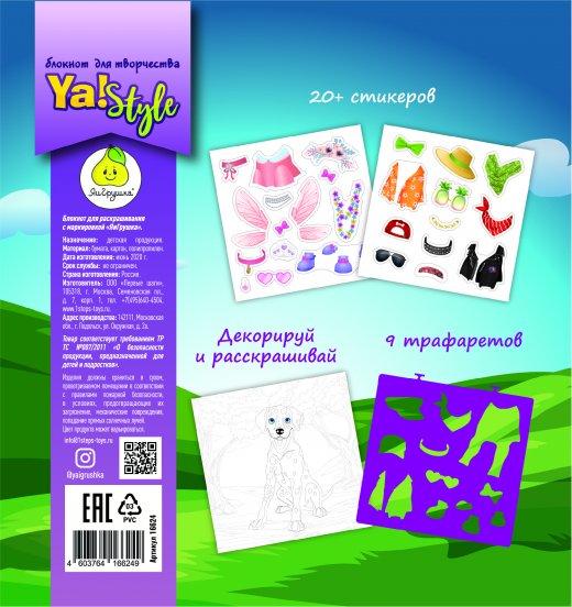 Состав: 1 лист - 9 шт трафаретов, 3 листа - стикеры 49 шт, 20 листов - эскизы для раскрашивания.