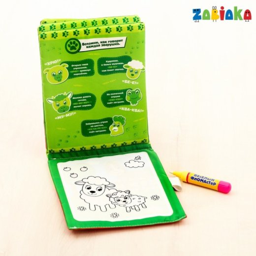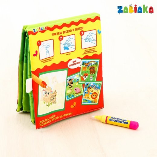В маркер набирается вода и ребенок рисует в книжке, рисунки черно-белые, как только ребенок проводит маркером по рисунку, он становится цветным, ярким и насыщенным. Через время, когда вода высохнет, рисунок становится бледнее, а позже становится черно-белым. Рисовать можно снова и снова. Многоразовая водная раскраска понравится вашим деткам!