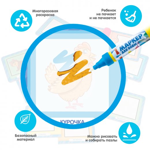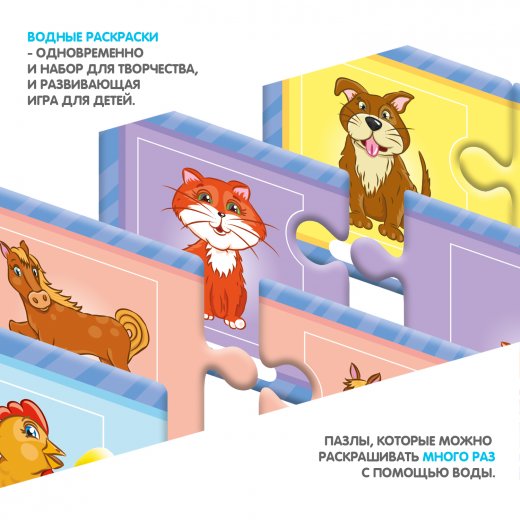 Водная раскраска послужит увлекательным занятием даже для тех, кто еще совсем не умеет рисовать. Достаточно наполнить ручку водой и провести по раскраске, и картинка, как по волшебству, начнёт проявляться различными цветами. После высыхания картинка опять становится бесцветной, и ребенок снова может раскрашивать её. Пазлы развивают образное и логическое мышление, наблюдательность и внимательность, а также мелкую моторику и координацию движений рук.