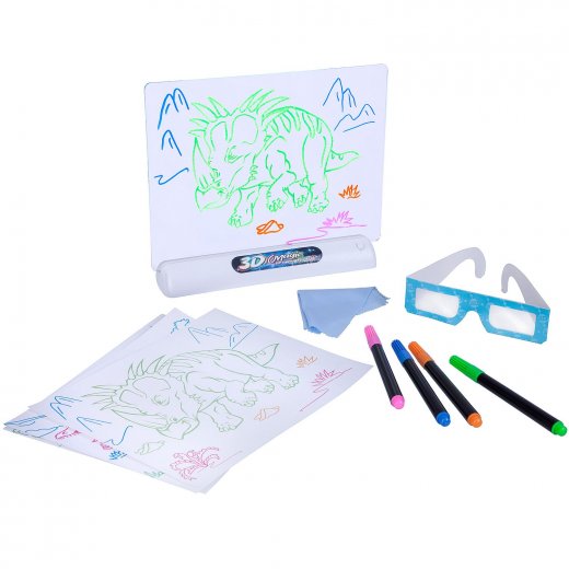 Для того чтобы насладиться 3D эффектом, достаточно надеть очки, также имеющиеся в наборе. Можно выключить свет - тогда рисунок на доске будет выглядеть еще красочнее и впечатляюще. Линии от маркеров легко стираются мягкой тканью, что дает возможность, как исправлять мелкие ошибки, так и менять изображение полностью. Подставка включается с помощью кнопки, которая работает от батареек 3xААА (не входит в комплект).