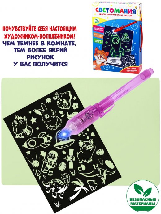 Только создан он светом. Фотолюминесценция абсолютно безопасна. Дети думают, что это волшебство, и увлекаются созданием своих светящихся картин.