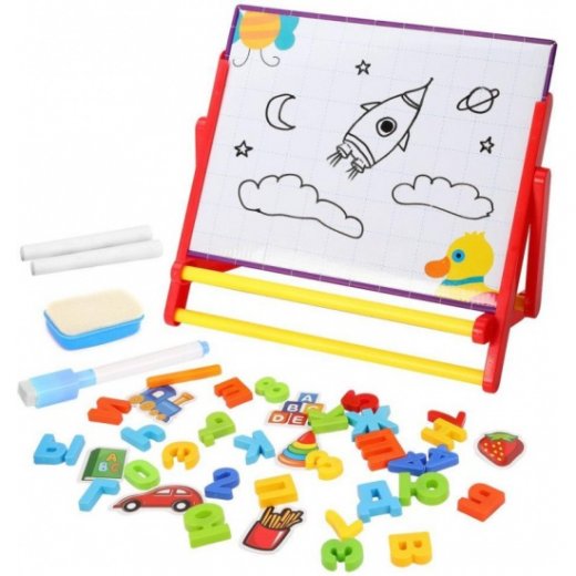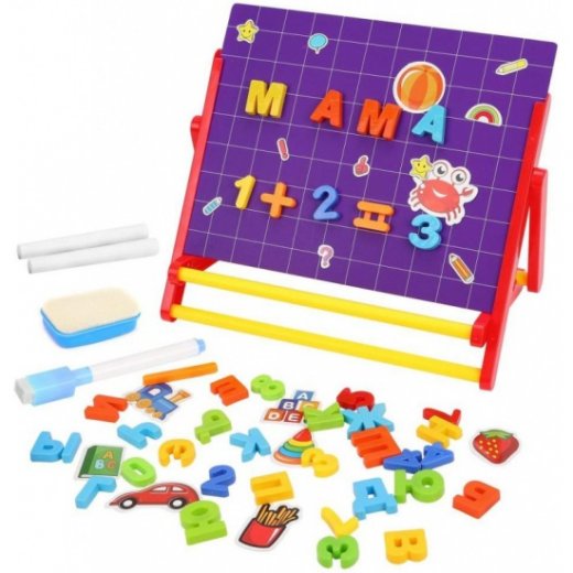 - В комплект набора входит: двусторонняя доска с магнитной и маркерной поверхностями, удобная подставка для доски, большое количество букв для легкого составления слов, цифры и математические знаки для составления примеров, маркер и мелки для рисования, 10 магнитных стикеров и 10 карточек для задач и сюжетных игр.
