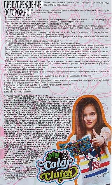 Состав набора: клатч, комплект из 6 акриловых красок, кисточка, пакетик с блестками (глиттером), акриловый лак на водной основе.