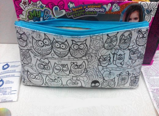 Состав набора: клатч-пенал с нанесенными контурами, краски, кисть, глиттерные блестки, акриловый лак.