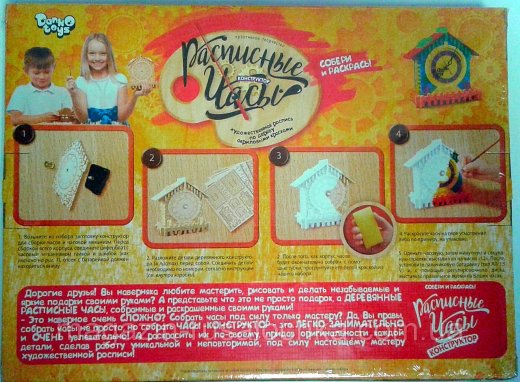 Состав набора: основа часов, пластиковый часовой механизм, кисть, губка, краски 12 цветов, инструкция.