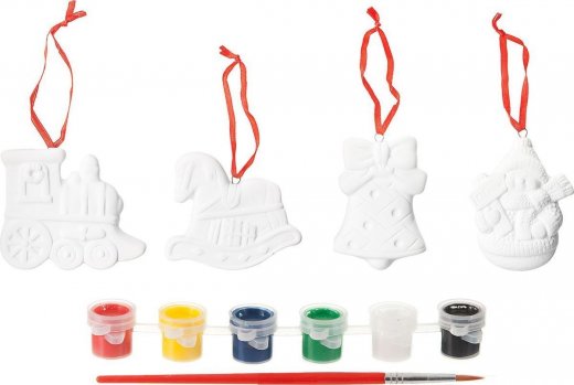 С помощью имеющихся в наборе предметов, кисточки и красок, нужно раскрасить керамические фигурки, изображающие паровоз, снеговика, колокольчик и лошадку. Раскрашивать и комбинировать цвета юный художник может как только ему представится в воображении и фантазии. Готовые украшения прекрасно дополнят праздничный интерьер.