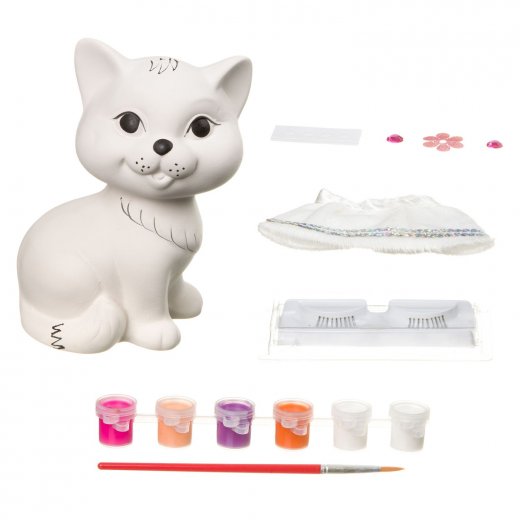 Состав набора: фигурка-копилка, ресницы, украшения, накидка, краски, кисточка.