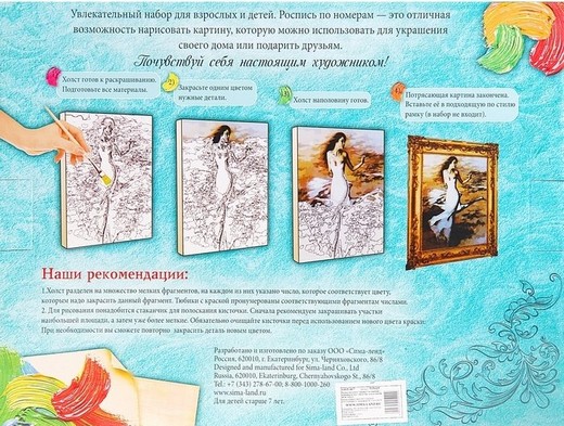 Холст разделен на множество мелких фрагментов, на каждом из которых указано число, соответствующее цвету, которым нужно закрасить данный участок. В набор входят все необходимые оттенки красок, каждый из которых пронумерован. Очень интересный и занимательный подарок для ребенка, который несомненно его увлечет. Раскрашивание способствует развитию мелкой моторике рук, образному и творческому мышлению, а также координации, аккуратности и усидчивости.