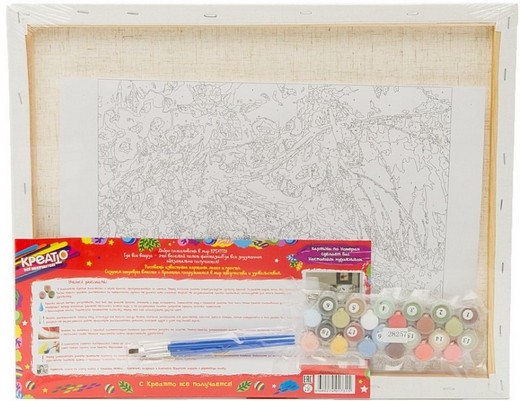 Состав набора: холст с нанесенным эскизом, акриловые краски 24 цвета, 3 кисточки, крепежные детали, контрольная схема рисунка.