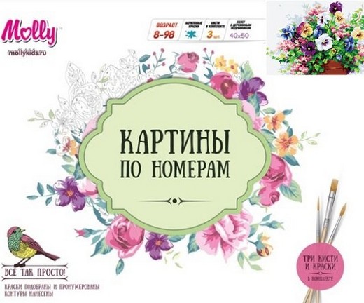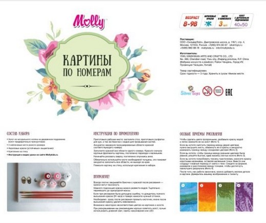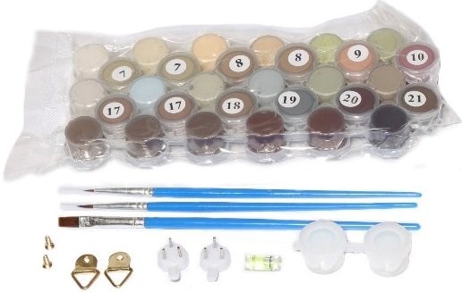 Состав набора: холст - сделанный из чистого хлопка на подрамнике, набор акриловых красок, индивидуально разлитый для каждой картины, набор кистей, крепеж для подвешивания картины, контрольный лист.