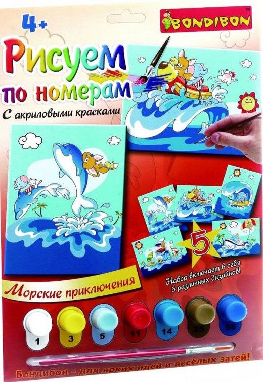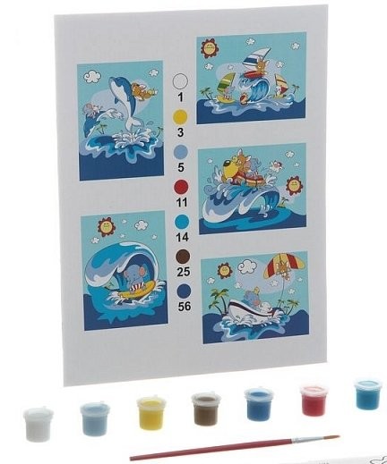 Если вы видите, что ваш ребенок любит рисовать, но у него пока не все получается, то такая раскраска по номерам как раз поможет малышу. Пять картинок, которые входят в набор, связаны между собой темой морских путешествий. Разнообразные зверушки: слоненок, котенок, лисенок - путешествуют по воде сидя на морских обитателях. В набор входит бумажная основа с нарисованным контуром. Ребенок должен раскрасить фрагменты с номерами соответствующим номеру цветом краски. При выполнении такой работы малыш должен быть сосредоточен и аккуратен. Зато результат превзойдет все ожидания! Раскрашивание способствует развитию творческого и образного мышления, аккуратности и координации, а также усидчивости ребенка.