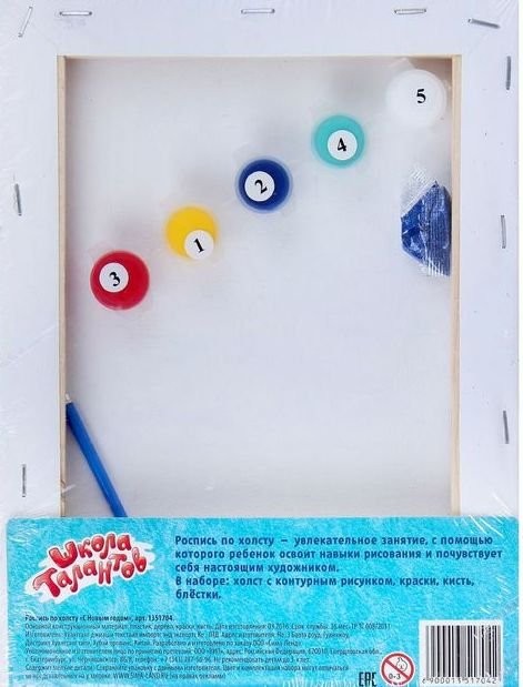Состав набора: холст на деревянной раме, 5 цветов краски, кисть, блёстки.