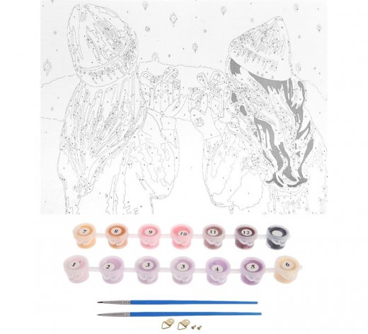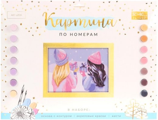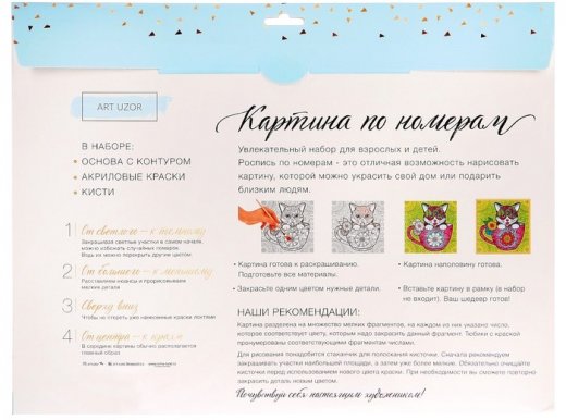 Состав набора: картина-основа с нанесёнными контурами рисунка, акриловые краски, кисть.