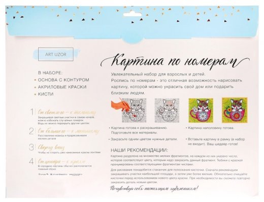 Состав набора: картонная основа со схемой рисунка, краски, кисть, инструкция.