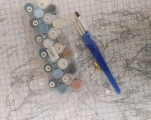 Состав набора: холст 40см*50см на подрамнике с пронумерованным рисунком, акриловые краски, 3 кисти разного диаметра.