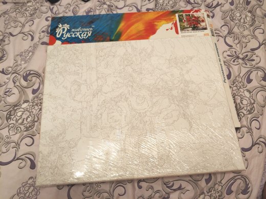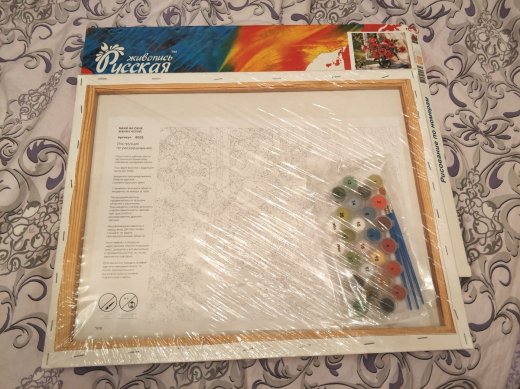 Состав набора: грунтованный холст, деревянный подрамник, комплект пронумерованных акриловых красок, набор кистей из эластичного нейлонового волокна, контрольный лист с нанесённой схемой, защитный лак.