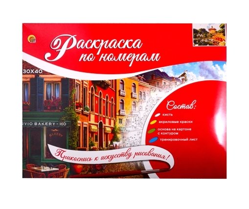 Состав набора: основа на картоне с контуром, акриловые краски, кисть, тренировочный лист.
