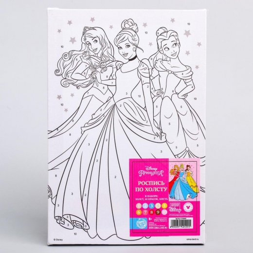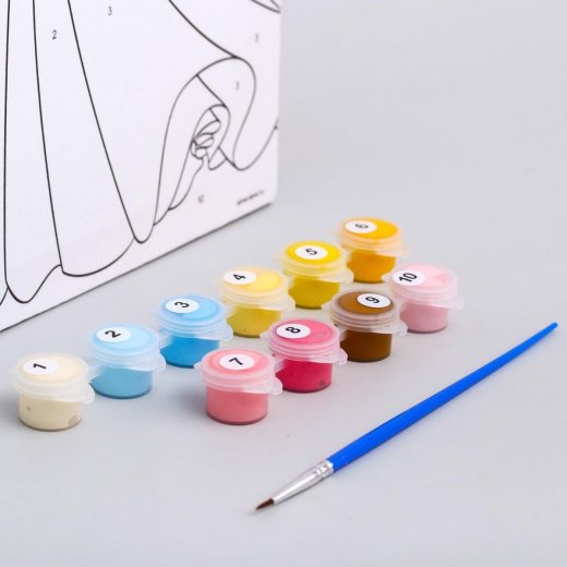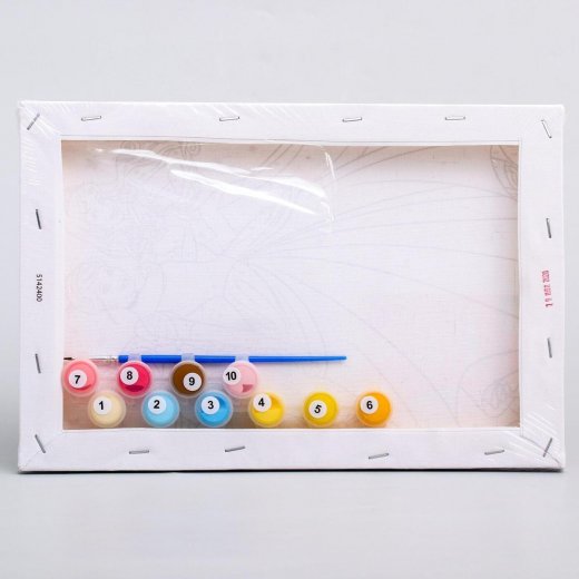 Состав набора: холст на подрамнике с пронумерованными контурами, краски акриловые в баночках (10 цветов), кисть, инструкция.