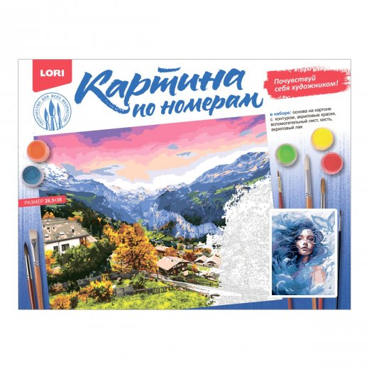 В набор входит основа на картоне с контуром изображения, акриловые краски, кисть, вспомогательный лист и акриловый лак.