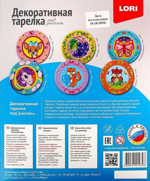 Состав набора: формы для отливки, гипс, краски, кисть, подставка для тарелки, инструкция.
