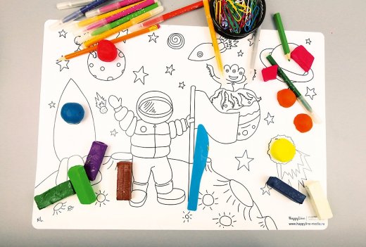 Защитный коврик-раскраска – это многоразовая многофункциональная раскраска торговой марки HappyArt для мечтателей и будущих космонавтов. Раскрашивать можно цветными карандашами и фломастерами. Карандаши стираются обычным ластиком, а фломастеры – просто смываются водой или влажной салфеткой.