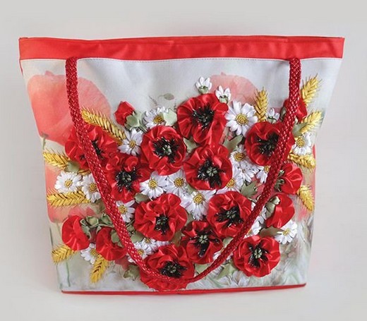 В наборе: сшитая сумка с плетеными ручками и мoлниeй-застежкой, подробная схема для вышивания нанесена прямо на сумку, комплект атласных лент, комплект бисера (пр-во Китай), нить, нить мулине, иглы-для лент и для бисера, инструкция-мастер-класс по вышивке в смешанной технике.