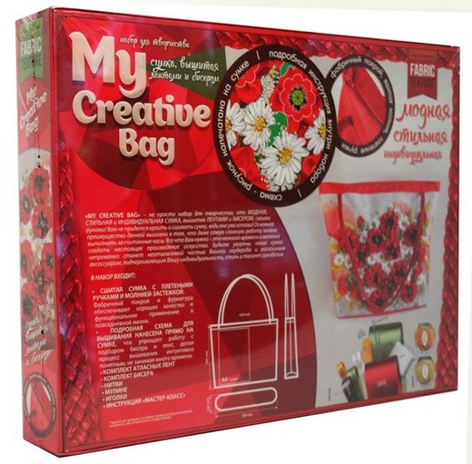 «MY CREATIVE BAG» – не просто набор для творчества, это модная, стильная и индивидуальная сумка, вышитая лентами и бисером, своими руками! Вам не придется кроить и сшивать сумку, ведь она уже готова! Основное преимущество данной вышивки в том, что даже самую сложную работу можно выполнить за считанные часы. Все что Вам нужно – это немного времени и желание создать настоящее произведение искусства. Будьте уверены: наша сумка непременно станет неотъемлемой частью Вашего гардероба и роскошным аксессуаром, подчеркивающим Вашу индивидуальность, стиль и талант рукоделия.