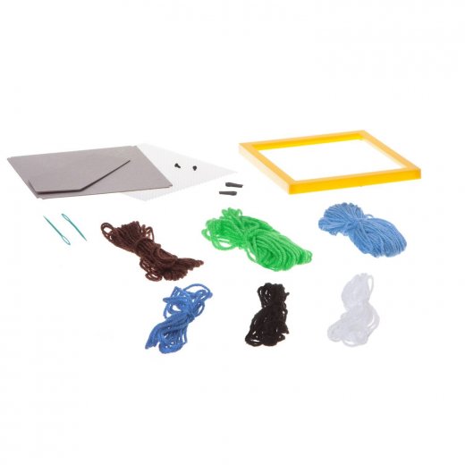 Состав набора: шерстяные нити, пластиковая канва, схема для вышивки, пластиковые иглы, пластиковая рамка, фурнитура для рамки.