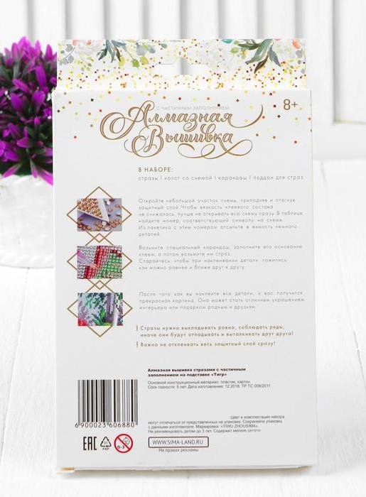 Разложите кристаллики с помощью карандаша по указанной схеме, полностью заполнив полотно. Картонная основа с клеевым покрытием будет надёжно удерживать стразы. На картине уже обозначены необходимые оттенки. Часть картины предстоит заполнить стразами, другая часть напечатана на самом холсте — такое изделие легче и быстрее создать. Поэтому набор такого небольшого формата подойдёт для тех, кто впервые пробует свои силы в этой технике или любит быстро добиваться результата.
