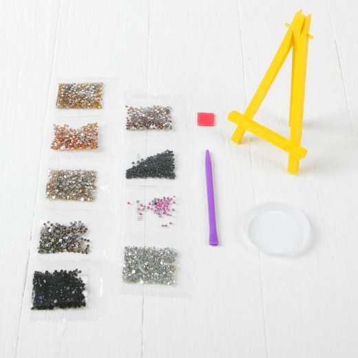 Состав набора: картонный холст со схемой, стразы, карандаш для страз, клеевая подушечка, подставка для готовой картины, ёмкость для страз.