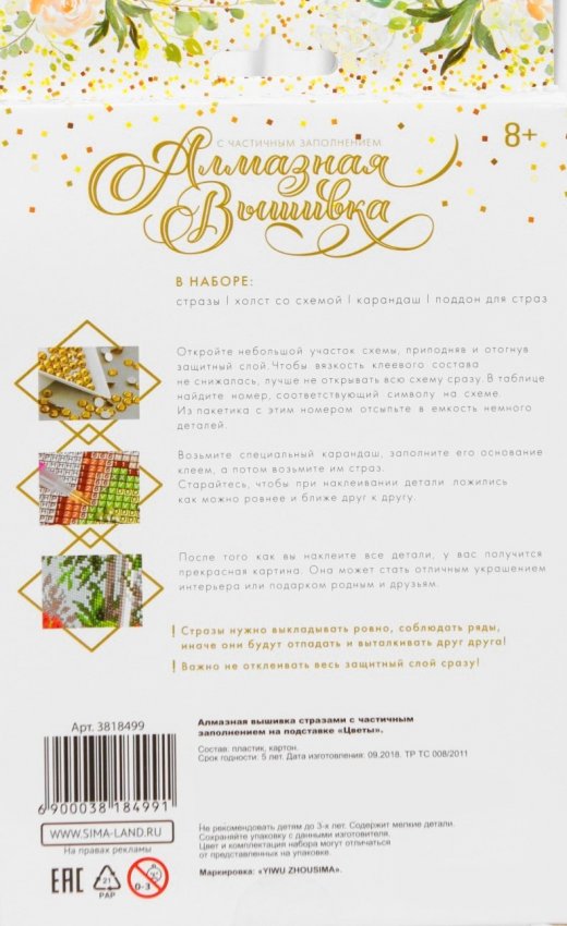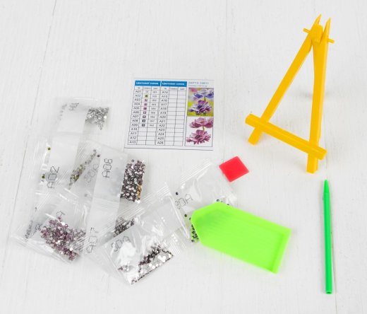 Состав набора: картонный холст со схемой, стразы, емкость для страз, карандаш для страз, клеевая подушечка, подставка для картины.