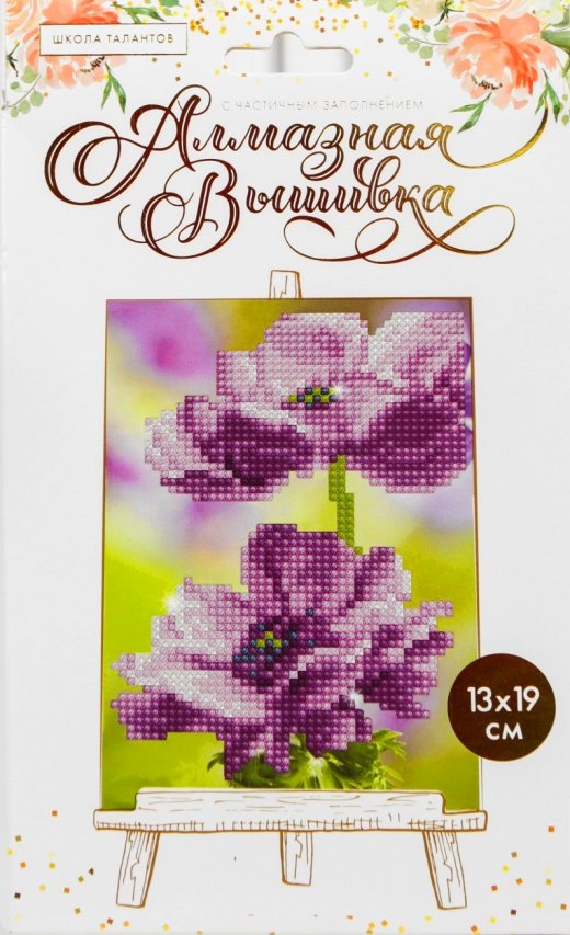 Часть картины предстоит заполнить стразами, другая часть напечатана на самом холсте — такое изделие легче и быстрее создать. Поэтому набор такого небольшого формата подойдёт для тех, кто впервые пробует свои силы в этой технике или любит быстро добиваться результата. В данном наборе есть небольшой мольберт, с ним готовое творение можно удобно расположить на полке или столе без дополнительных креплений.