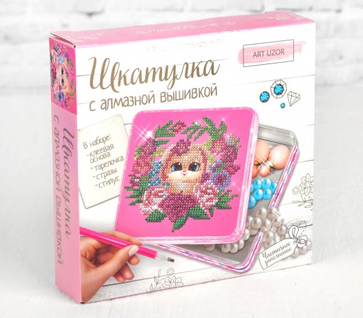 Состав набора: картинка-наклейка, стразы, поддон для страз, специальный карандаш, металлическая шкатулка 14х13,6 см.
