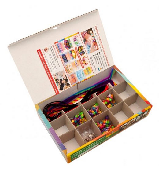 В наборе: Разноцветные пластиковые бусины, нейлоновый шнур, шенилловые проволочки, кольца для бус, замки для бус.