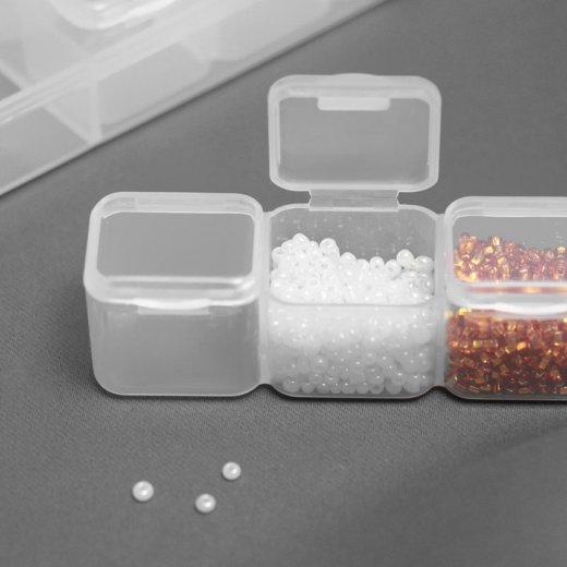 Контейнер разделён на отсеки, куда вы сможете разложить разные детали или аксессуары. С ним вы не перепутаете и не рассыплете бисер, а прозрачный пластик, из которого изготовлен контейнер, позволит с лёгкостью найти нужный вам цвет и размер бусин.