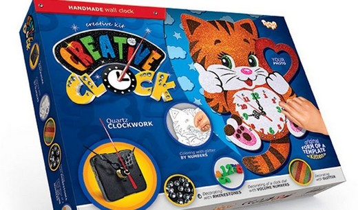 Кроме того, во время работы над часами детки смогут развивать свои творческие способности и креативность. Ведь работа предстоит сразу в нескольких направлениях: раскрашивание циферблата глиттером по номерам, декорирование стразами, украшение циферблата объемными цифрами и в завершение - сборка, настройка и присоединение часового механизма.