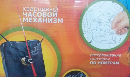 В наборе: картонная заготовка-форма, толщина 3мм, кварцевый часовой механизм, объемные цифры, 2 палеты, набор страз, разноцветный глиттер, 9 упаковок.