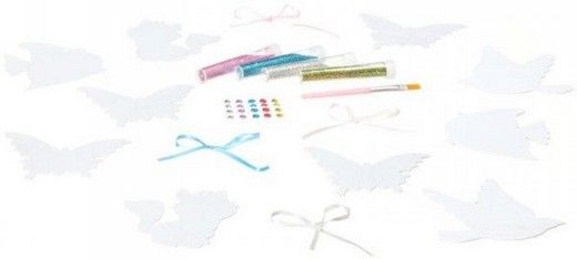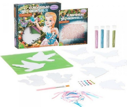 Состав набора: 10 бумажных подвесок с клеевой поверхностью, 4 бутылочки с блестками, 20 страз, 10 разноцветных ленточек, инструкция.
