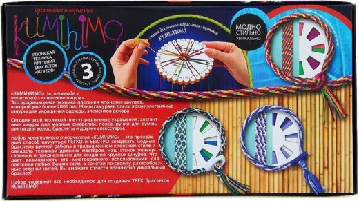 Станок для плетения браслетов жгутиков Кумихимо – это замечательный набор, который обязательно заинтересует ребенка и увлечет в творческую работу по созданию браслетов. Браслеты плетутся при помощи специального станка, который входит в набор. В инструкции подробно опии сан весь процесс и поверьте он весьма прост. Ребенку который любит поделки своими руками такой подарок несомненно понравится, ведь теперь она сам, по своему вкусу и усмотрению, сможет сделать себе украшение. А также готовый браслет, например можно подарить или надеть на прогулку, поделка выглядит очень качественно и стильно.