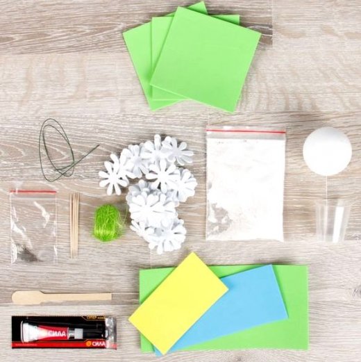 Состав набора: пенопластовый шар, FOM EVA (пористая резина), проволока, сизаль, стакан, гипс, ложка, зубочистки, клей, выкройка.