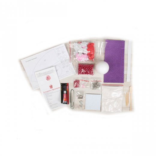 В комплекте: пенопластовый шар, пористая резина, готовая вырубка, проволока, бусины, бисер, гвоздики-булавки, стакан пластиковый, гипс, ложка, зубочистки, клей, выкройка.
