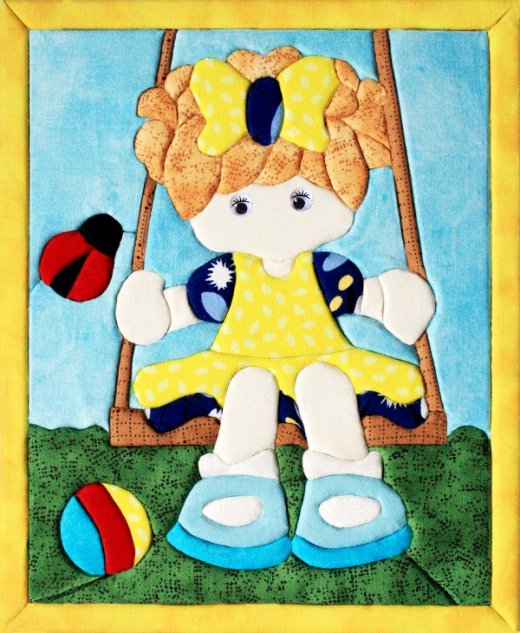 "Кинусайга" или как ее еще называют "пэчворк" без иглы - техника рукоделия, зародившаяся на Востоке, в Японии. Это необыкновенный способ создания картин, не требующий применения иголки. Использовать данную технику можно практически во всем: в создании панно, шкатулок, игрушек, предметов интерьера. Лоскутная мозаика получила необыкновенную популярность во всем мире, нашла своих поклонников. Создавать лоскутные картины в технике "кинусайга" очень просто, но крайне увлекательно. Кусочки ткани крепятся на специальной основе, образуя сюжетное изображение. Картина "Девочка" изображает малышку, качающуюся на качелях.